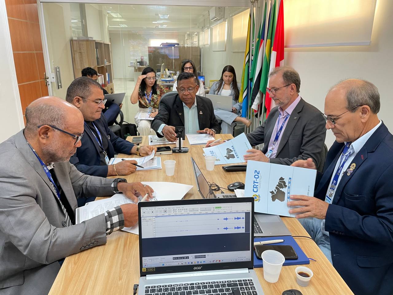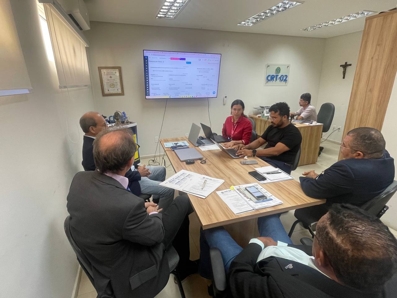 No final da tarde, a reunião foi interrompida brevemente para que a Diretoria Executiva recebesse os agentes de fiscalização do CRT-02. Desde terça-feira, 03 de dezembro, esses profissionais estão reunidos na sede do Regional, em São Luís, para uma ação jurisdicional de grande relevância.