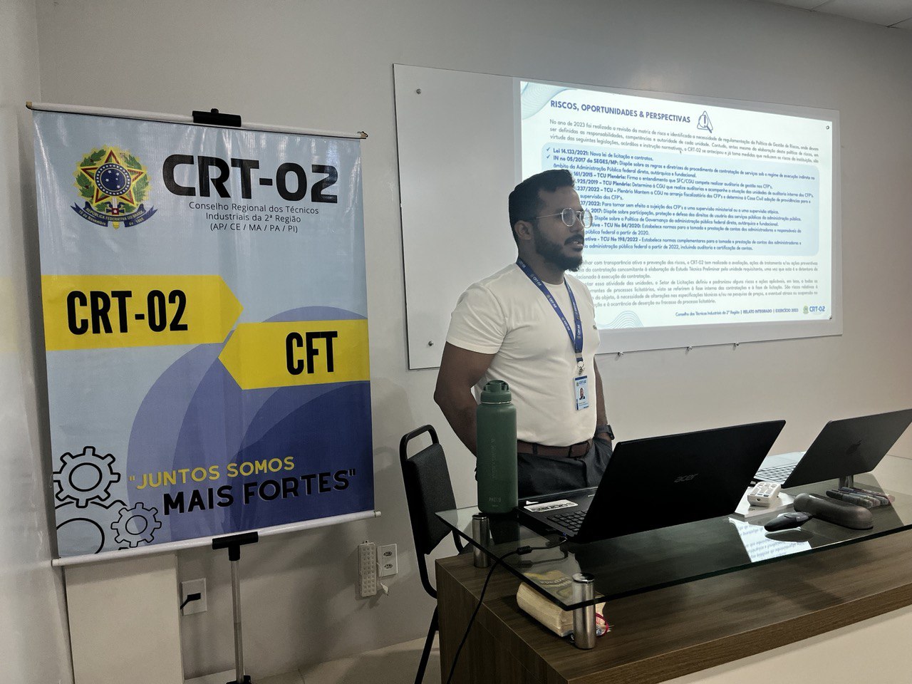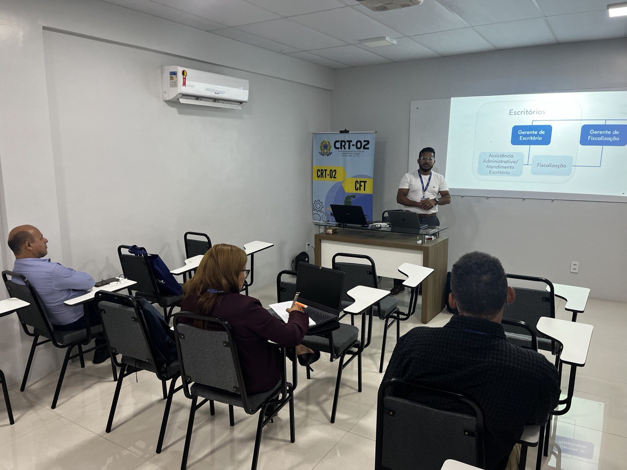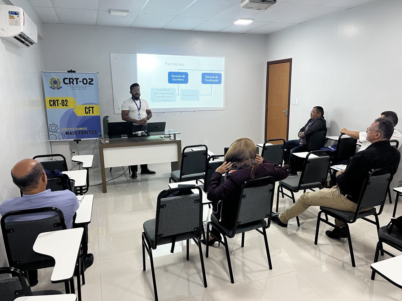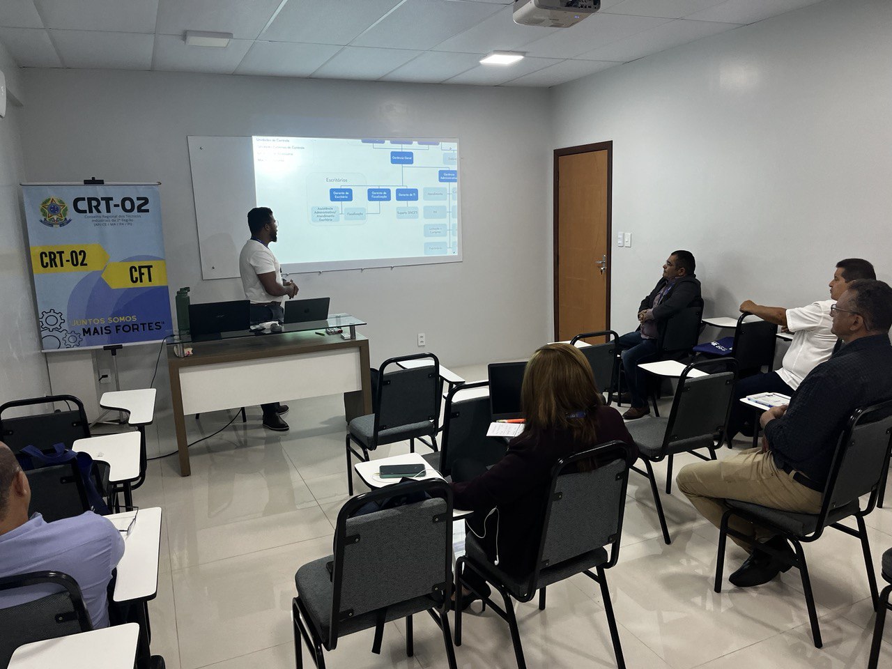 A necessidade de padronização e de aprimoramento das estratégias de gestão foi o ponto central das discussões, evidenciando um movimento coletivo em busca de eficiência, qualidade no atendimento e robustez na fiscalização das atividades técnicas industriais na região. A primeira palestra do dia foi conduzida por Jozerly Junior, Assessor de Planejamento Estratégico do CRT-02, que compartilhou insights valiosos sobre planejamento e execução estratégica, sublinhando a importância de um alinhamento coeso entre os escritórios regionais.