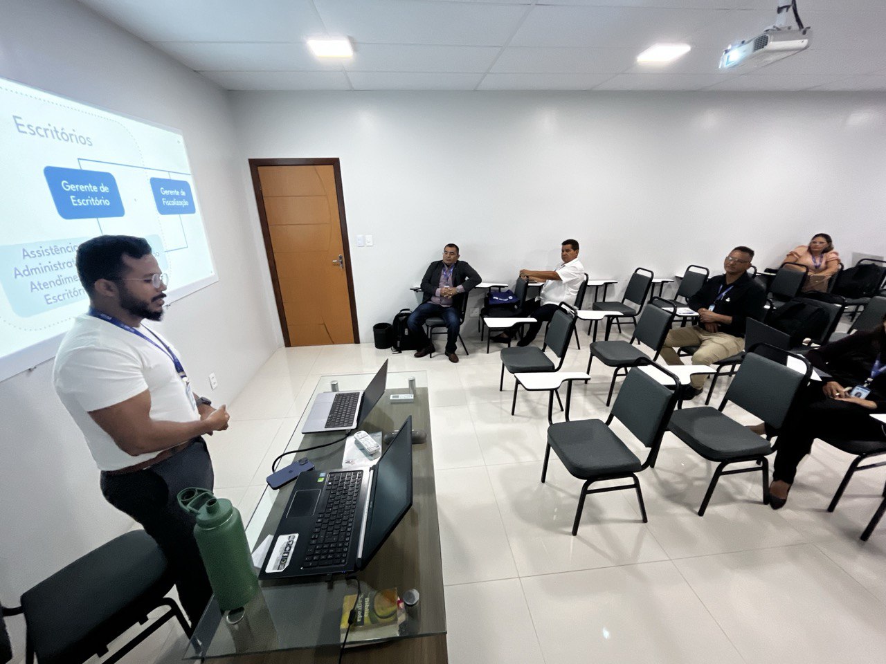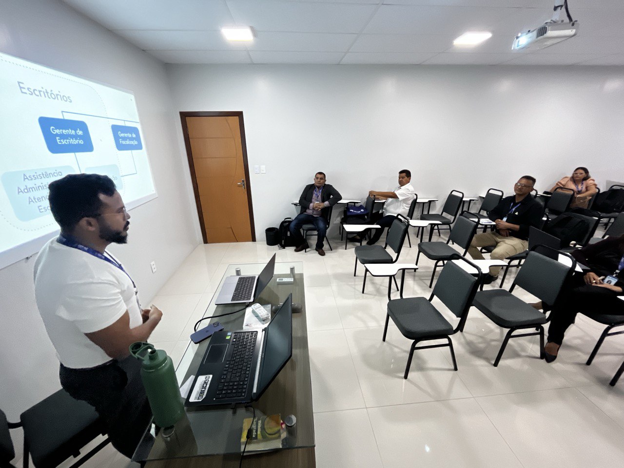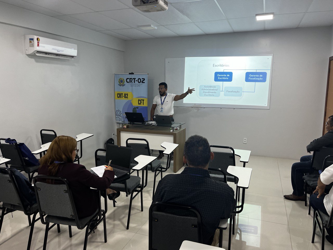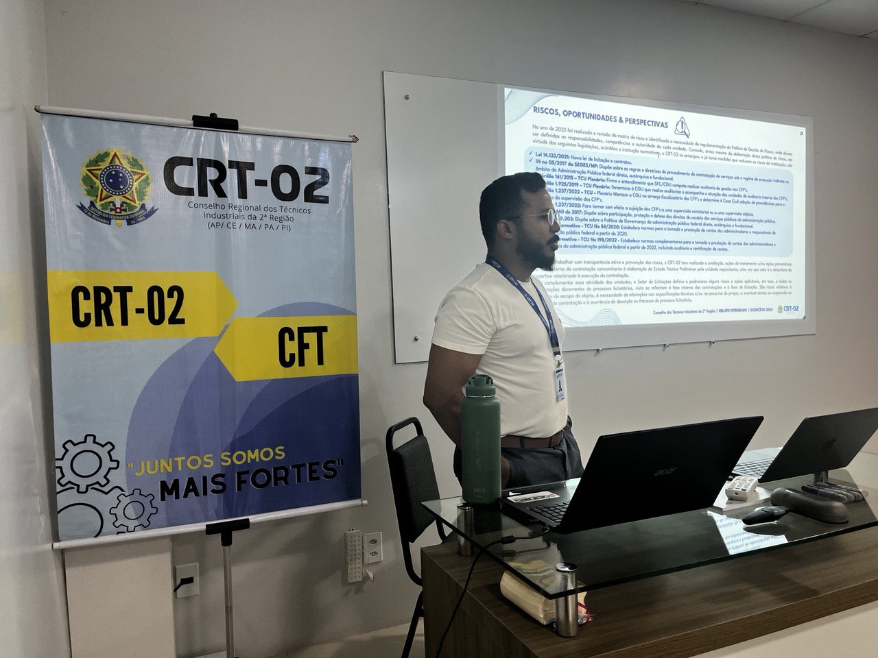 A necessidade de padronização e de aprimoramento das estratégias de gestão foi o ponto central das discussões, evidenciando um movimento coletivo em busca de eficiência, qualidade no atendimento e robustez na fiscalização das atividades técnicas industriais na região. A primeira palestra do dia foi conduzida por Jozerly Junior, Assessor de Planejamento Estratégico do CRT-02, que compartilhou insights valiosos sobre planejamento e execução estratégica, sublinhando a importância de um alinhamento coeso entre os escritórios regionais.