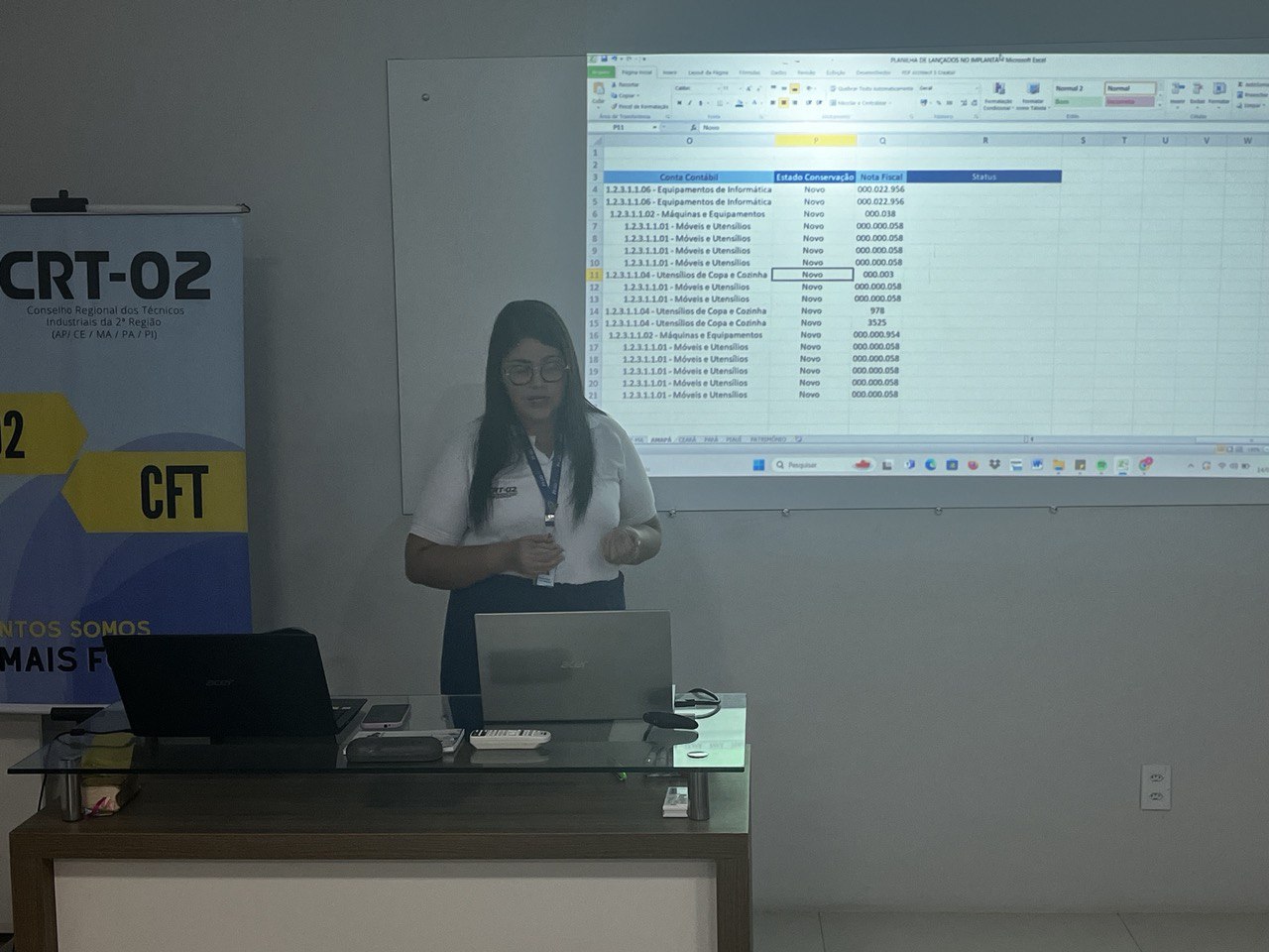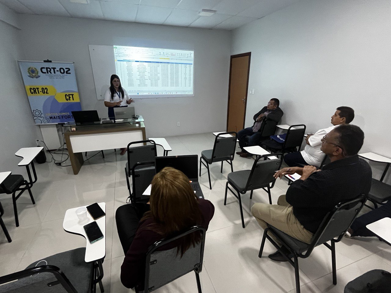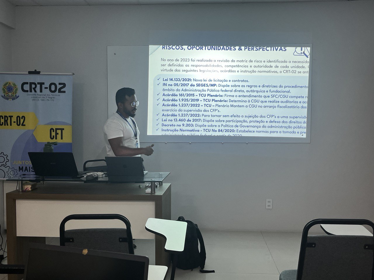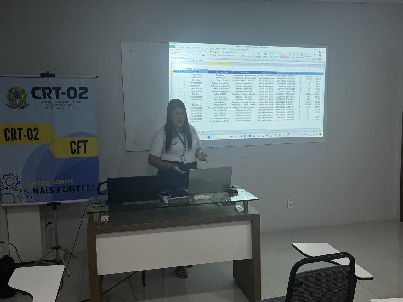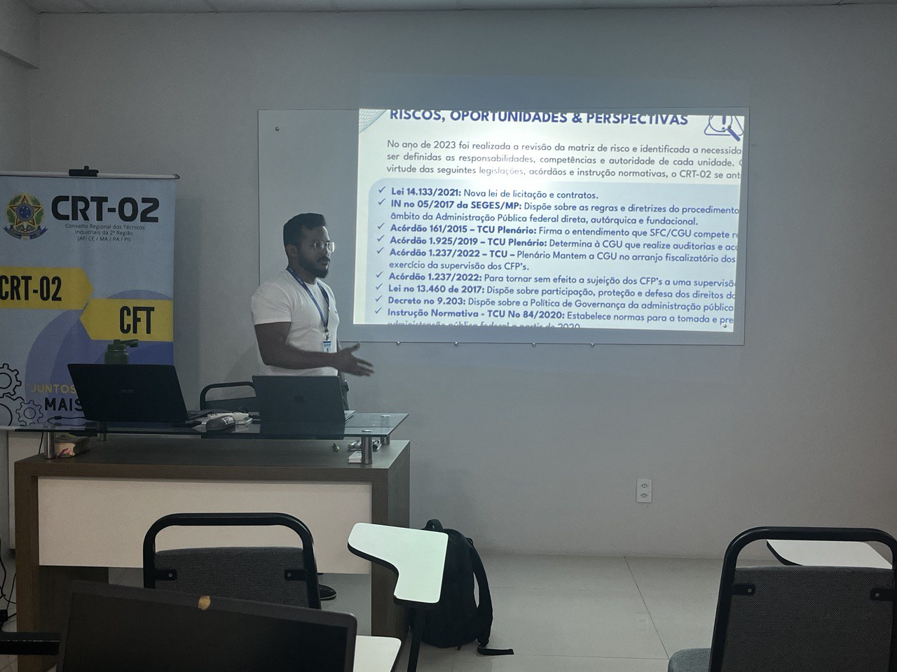 Além disso, a temática do Patrimônio foi abordada por Jessica Rocha, Chefe do Almoxarifado do CRT-02, que apresentou práticas e diretrizes para a gestão eficiente dos recursos materiais, destacando a relevância do controle patrimonial como pilar para a transparência e responsabilidade administrativa.