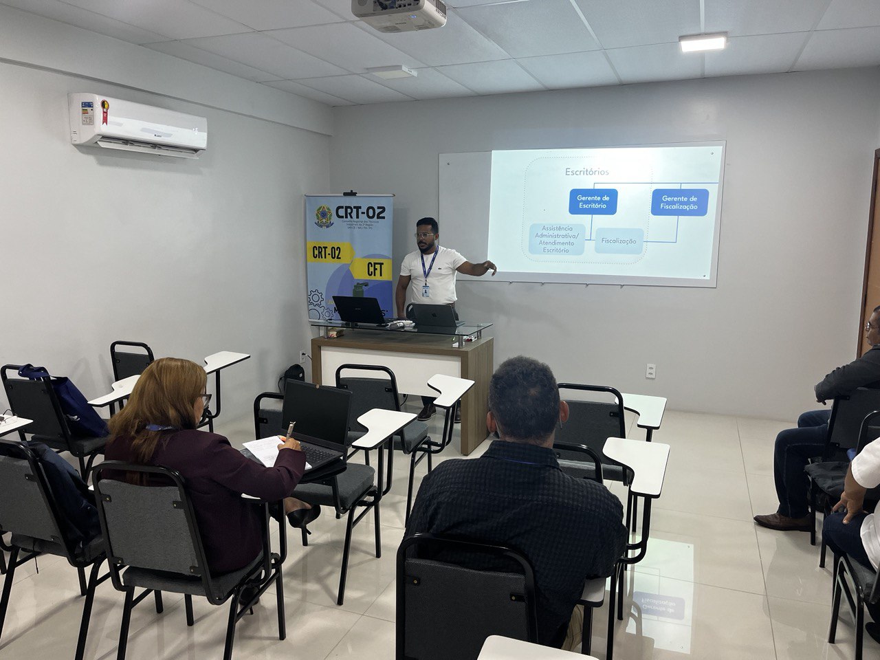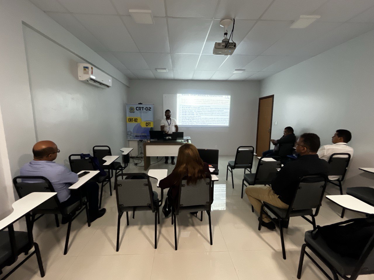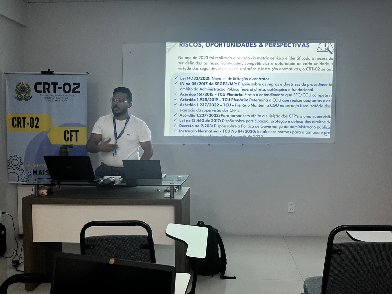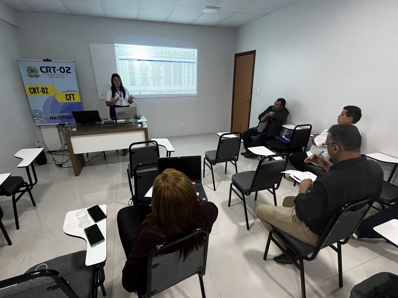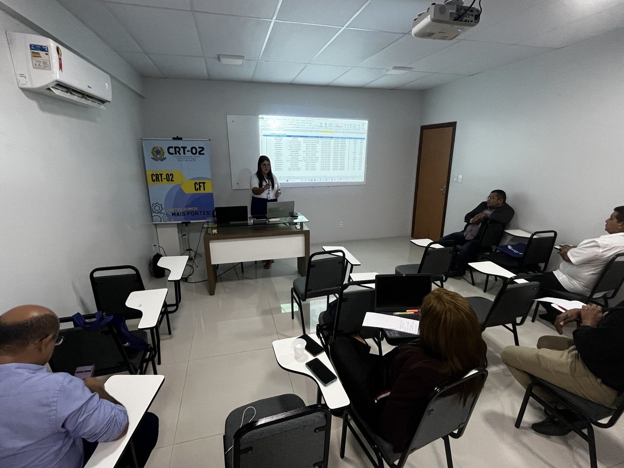 Além disso, a temática do Patrimônio foi abordada por Jessica Rocha, Chefe do Almoxarifado do CRT-02, que apresentou práticas e diretrizes para a gestão eficiente dos recursos materiais, destacando a relevância do controle patrimonial como pilar para a transparência e responsabilidade administrativa.